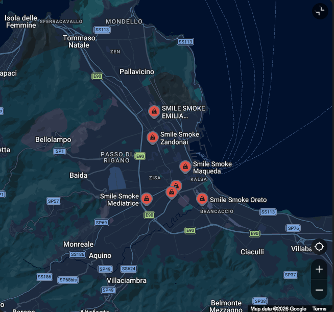 Se stai cercando sigarette elettroniche vicino a te a Palermo, Smile Smoke è il punto di riferimento da oltre 15 anni per qualità, competenza e servizio. Con più punti vendita distribuiti in città, siamo sempre a pochi minuti da te, pronti a offrirti un’esperienza semplice, veloce e affidabile. Nei nostri store trovi un’ampia selezione di liquidi, aromi, resistenze e basi, scelti tra i migliori brand per garantirti sempre performance e sicurezza. Ma ciò che ci distingue davvero è l’approccio: ogni cliente viene seguito con attenzione, perché crediamo che la scelta del prodotto giusto faccia la differenza. Che tu sia alle prime armi o un utilizzatore esperto, da Smile Smoke trovi consulenza reale, disponibilità immediata e un team che parla chiaro. Non devi perdere tempo a cercare online: hai tutto quello che ti serve, subito, vicino a te a Palermo.Entra in uno dei nostri punti vendita Smile Smoke e scopri perché, da anni, siamo il riferimento per chi cerca sigarette elettroniche, liquidi e accessori con un servizio serio e orientato al cliente.